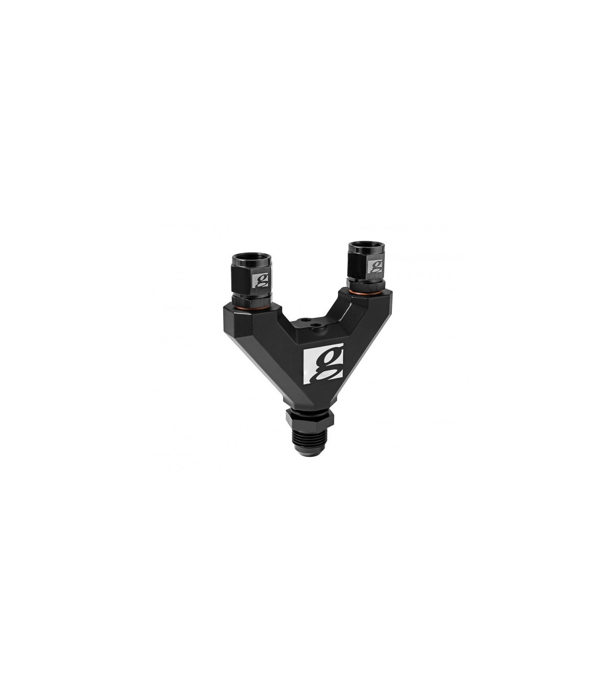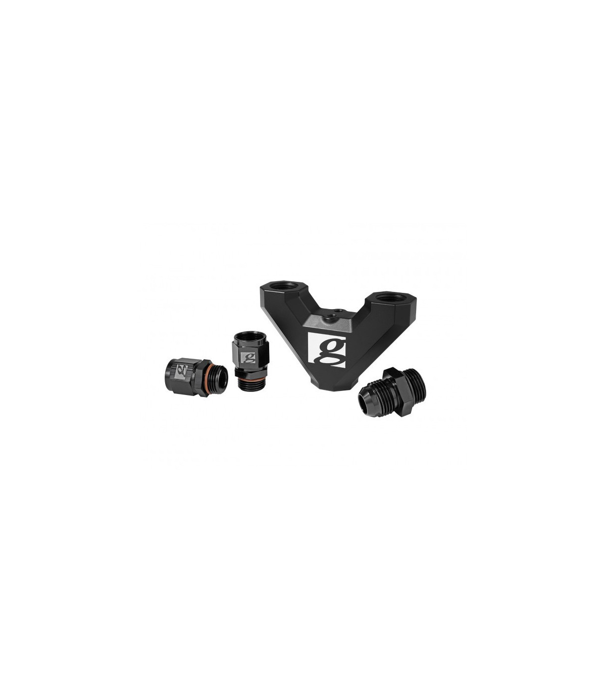 The Grams Fuel Pump Y-Block is machined from billet aluminum and hard anodized for use with all known fuels including gasoline, methanol, and ethanol. The Grams Y-Block features two -8 AN female flare fittings, one -10 AN male flare fitting and lines up perfectly with the Grams Billet Dual Fuel Pump Mount (P/N: G2-99-3010) and Grams 355 In-Line Fuel Pumps.