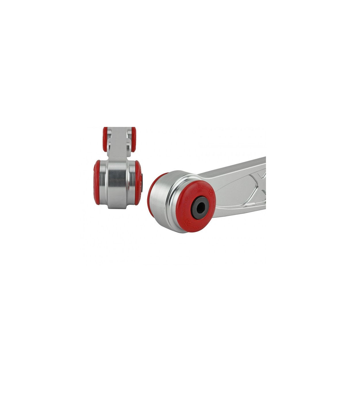 Accurate suspension geometry is maintained under the most aggressive driving conditions using high load steel spherical bearings on the trailing arm side and tuned durometer elastomeric bushings for the sub frame side of the LCA. Delrin bushings are utilized at the shock mounting position for their low friction and minimal deflection for unparalleled dynamic shock control. Using this specific combination of bushings allows the most comfort and control under any driving conditions.
